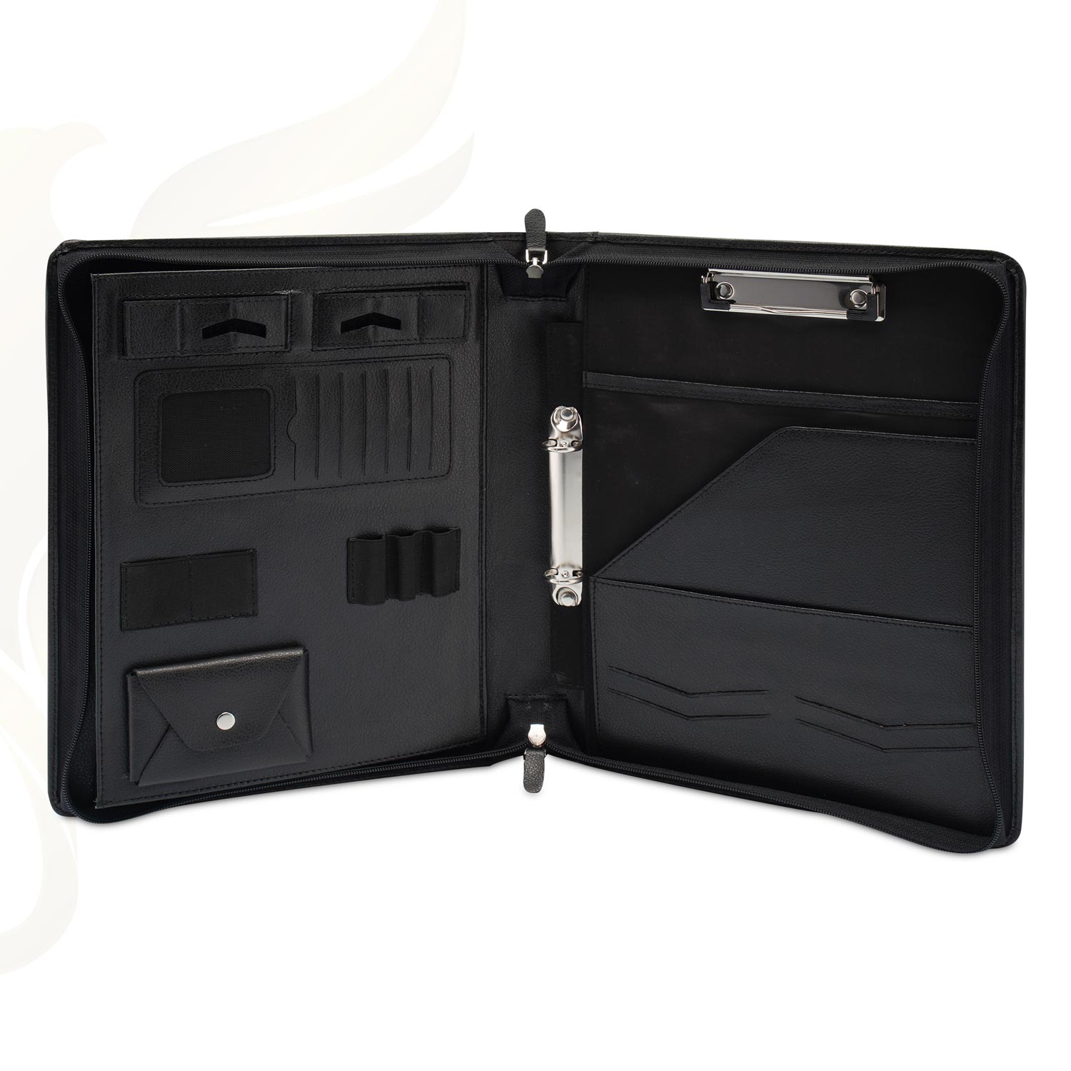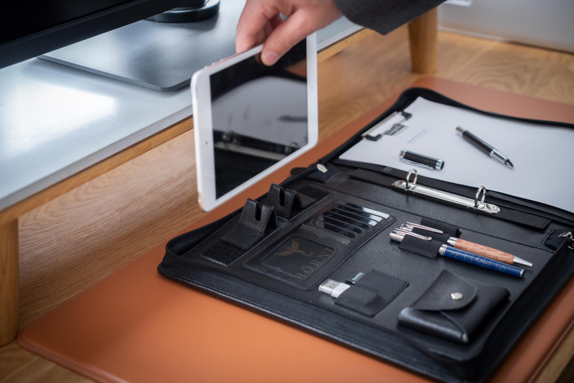 Dank dem herausnehmbaren Ringordner können Sie Ihre wichtigen Dokumente mit einem Griff entfernen und sofort losarbeiten. Ohne lästiges Aus- und Wiedereinheften und ohne, dass dadurch wichtige Unterlagen an der Lochung einreißen. Die integrierte Klemme verhindert das Verrutschen Ihres Schreibblocks und hält Ihre Mappe sauber. Sicher in dem mit Samtstoff ausgekleideten Tabletfach verstaut ist Ihr Laptop oder Tablet unterwegs, auf dem Weg zur Arbeit oder ins Büro oder auf der nächsten Dienstreise optimal vor Kratzern und Stößen geschützt. Mit einem extra Fach für bis zu 25 Visitenkarten sind Sie jederzeit bereit, neue Kontakte zu knüpfen. Ihre Bankkarten finden in einem von elf Slots mühelos Platz. Eingenähte Stifthalter sorgen dafür, dass Sie immer sofort das passende Schreibgerät zur Hand haben. Weitere Fächer innen und außen bieten zusätzliche Verstaumöglichkeiten und strukturieren Ihre Mappe. Abgerundet wird das Design durch unsere Tablet-/ Handyhalterung, die Ihre Hände entlastet.