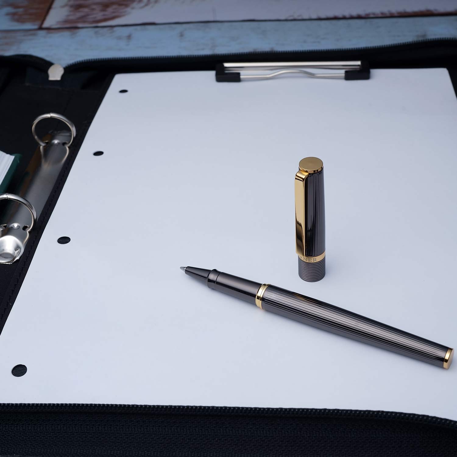 Der Tintenroller ist mit 33 Gramm Gewicht optimal ausbalanciert und bietet ein sauberes und gleichmäßiges Schreibgefühl, ohne das Handgelenk zu belasten. Die geriffelte Oberfläche sorgt für einen angenehmen, rutschsicheren Halt. Der Slide-In-Deckel schützt die Mine vor Austrocknung und der Clip lässt sich dank horizontal eingearbeiteter Linien einfach öffnen.